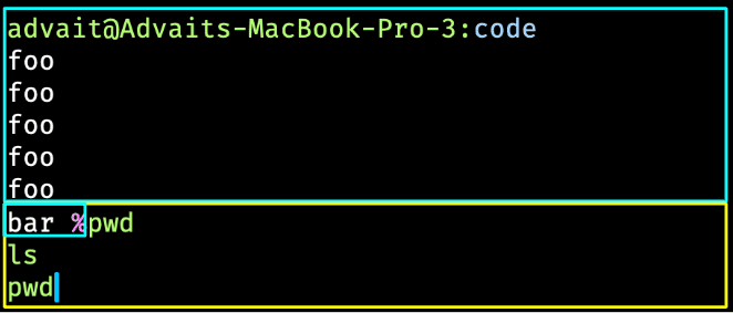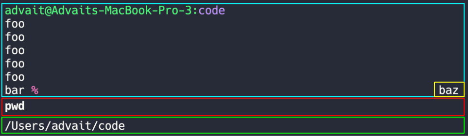 You can imagine that we can no longer have two rectangles neatly stacked on top of each other, since the last line of the prompt and the first line of the command should now exist on the same row. To solve this issue, we split the prompt into two separate grids. In this case, the first prompt grid would cover the first five “foo”s, and the second prompt grid would cover the “bar %.” This allows us to put the input editor component inline beside the prompt.